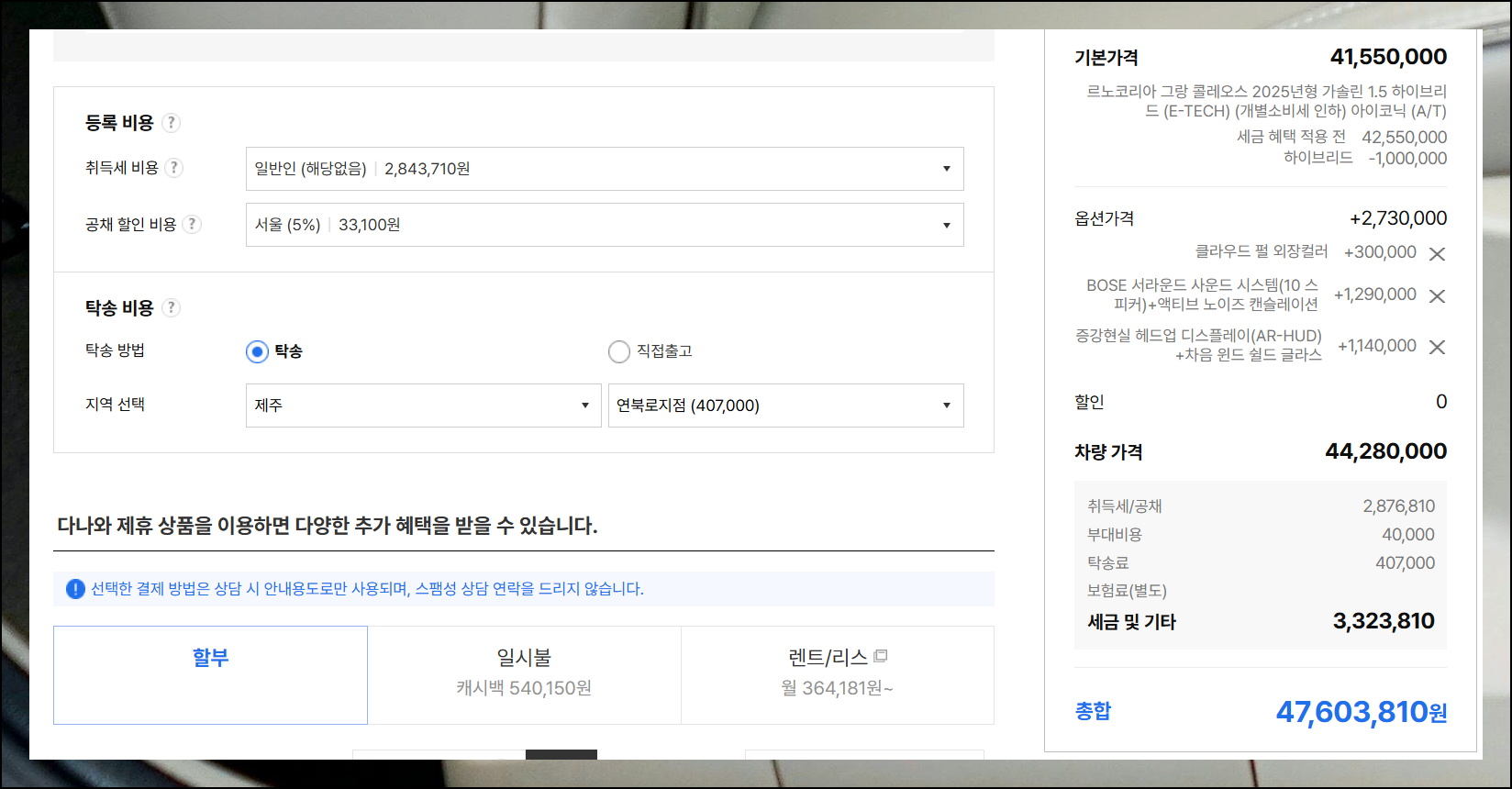 끝으로 취득세, 공채, 탁송료와 관련된 세부 사항들을 선택해야 해요. 면세 해당 여부, 차량 등록할 지역, 탁송 방식과 배송 지역을 선택하시면 됩니다. 이 모든 과정을 마치면 화면 우측에서 그랑 콜레오스의 정확한 신차가격표를 최종 확인할 수 있어요.