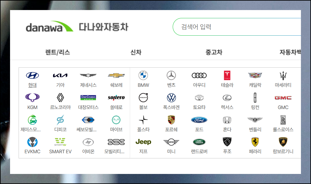 다나와 사이트 첫 화면에 들어가면 현대, 기아, 제네시스, 쉐보레, BMW 같은 주요 자동차 브랜드들이 쭉 나열되어 있습니다.