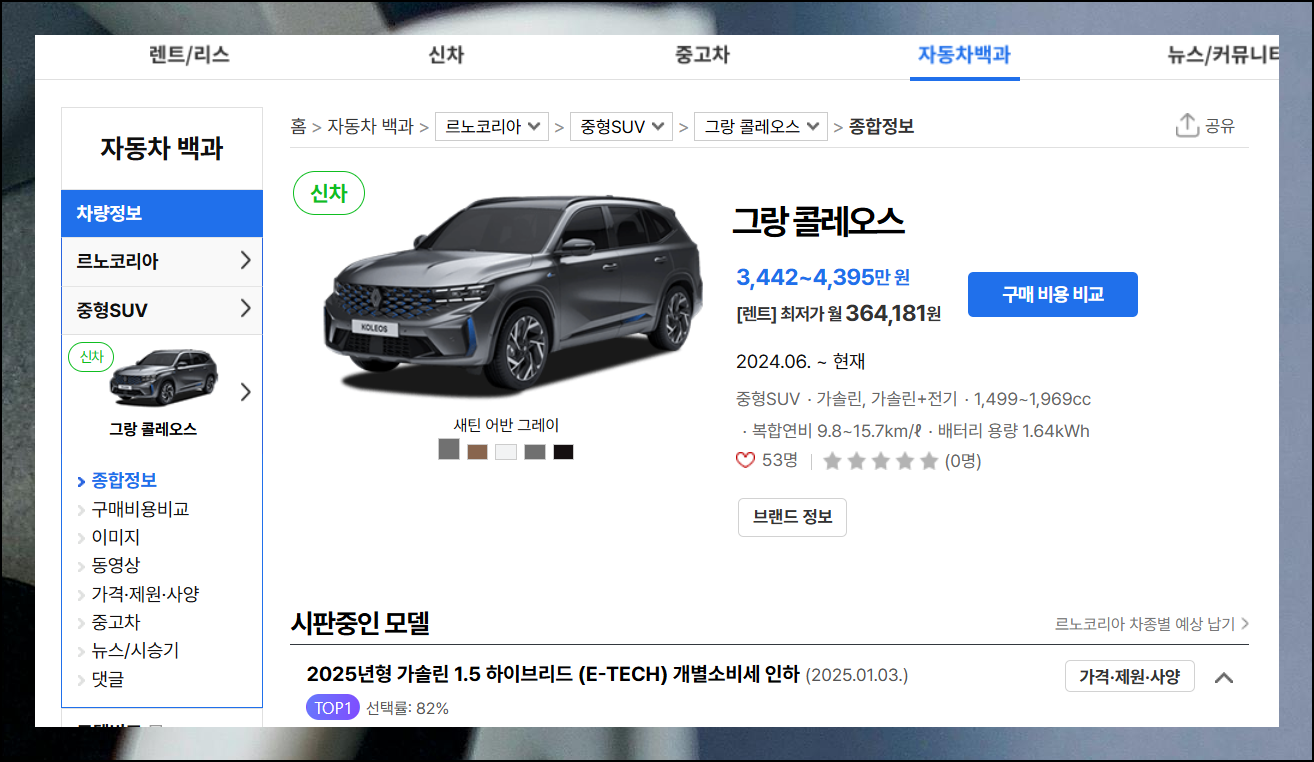 방금 직접 확인해본 결과를 보여드릴게요. 2025년형 르노삼성 그랑 콜레오스 가솔린 1.5 하이브리드 자동차 모델을 예시로 들면, 웹사이트에서 바로 정확한 최종 금액을 파악할 수 있어요.