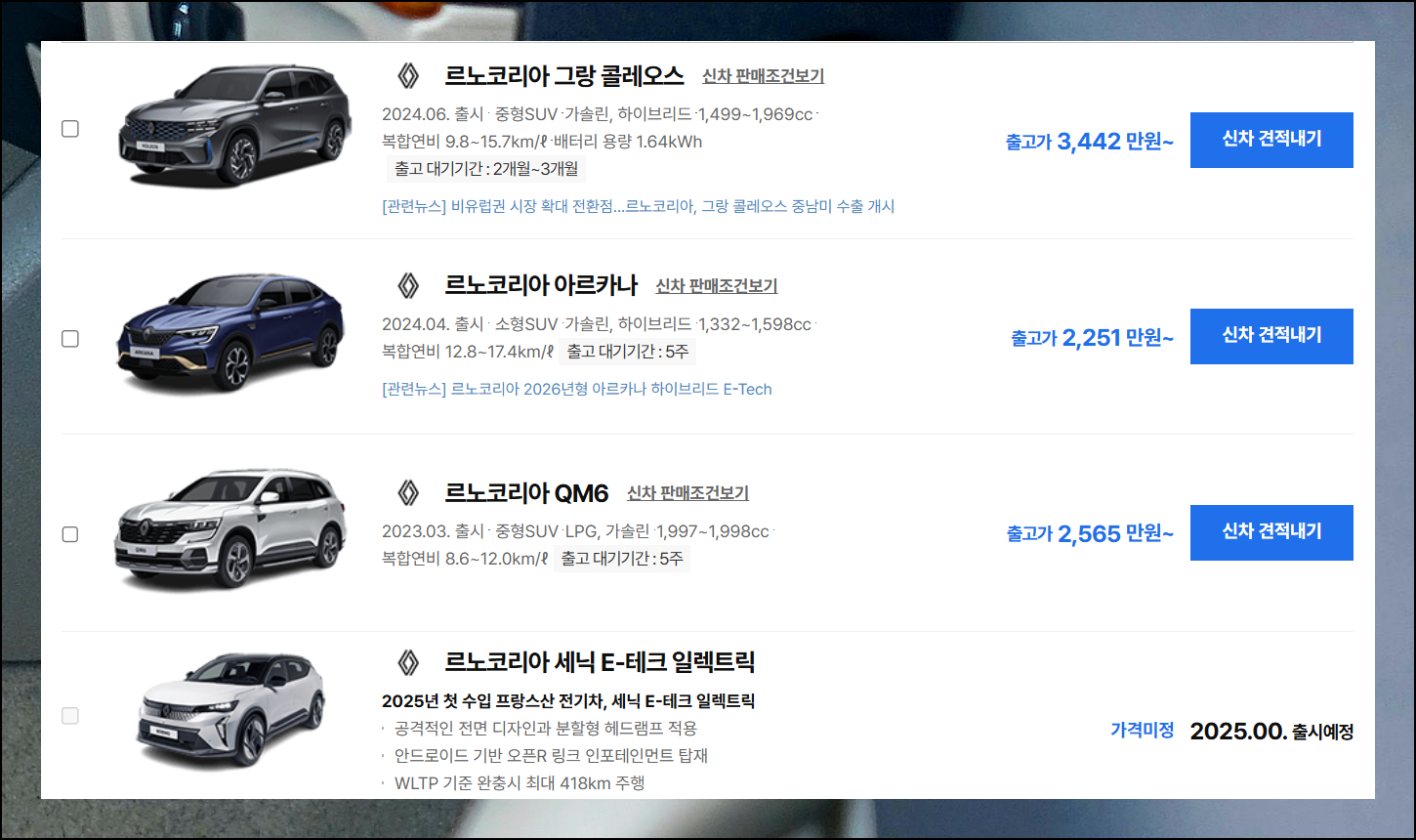 여기서 '르노코리아'를 클릭하시면 되는데요. 예전 르노삼성에서 브랜드명이 바뀐 것이니 혼동하지 마세요.