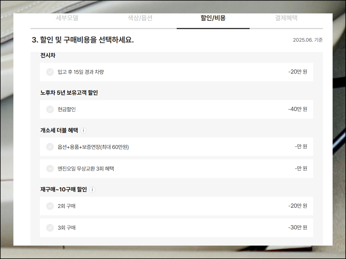 할인 및 구매비용 선택 화면에서는 앞서 언급했던 판매조건을 다시 만나게 됩니다. 본인이 실제로 활용할 수 있는 조건들만 선택해주시면 되는데요. 이렇게 판매조건을 적용하면 해당하는 할인 혜택이 반영된 가격표를 확인할 수 있습니다.