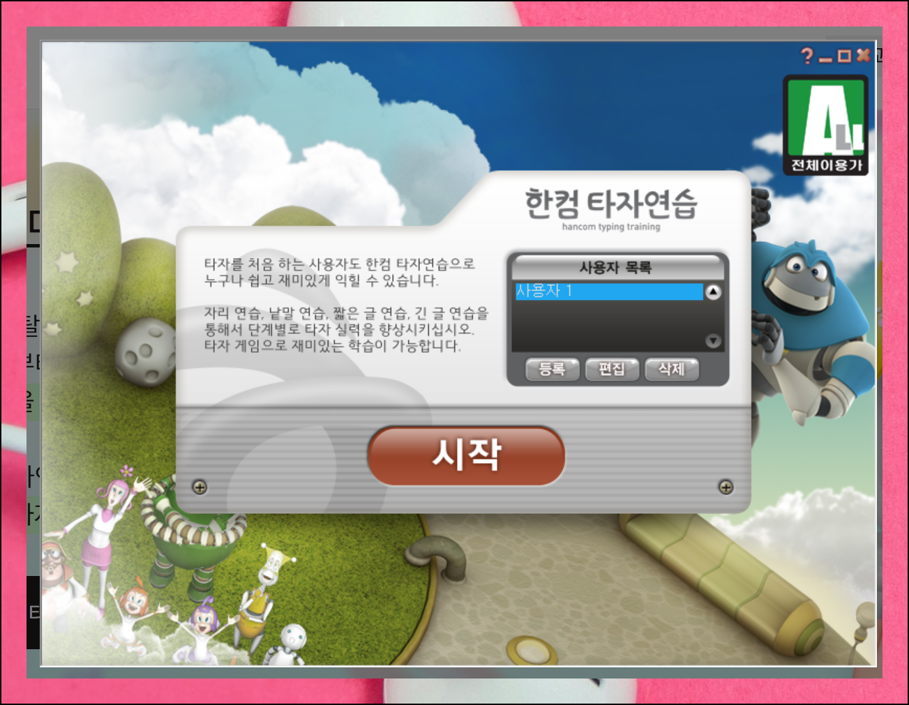 설치가 완료되면 한글타자연습 프로그램을 실행해보세요. 처음 시작하면 사용자 등록 화면이 나타날 텐데요. 개인 정보를 등록해도 좋고, 건너뛰고 바로 시작 버튼을 눌러도 괜찮습니다.