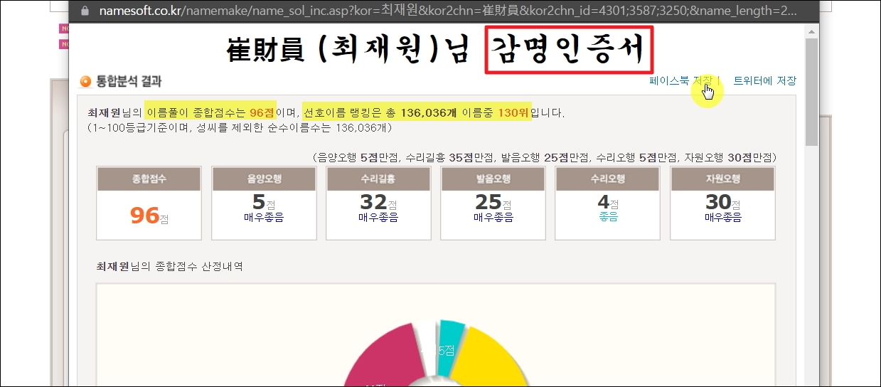 ▼이름풀이 버튼을 누르면 여러 가지 분석한 결과를 나타내는 감명인증서가 나타납니다. 페이스북이나 트위터로 저장할 수 있게 되어 있으니 저장 후 지인들과 공유해보시길 바랍니다.
