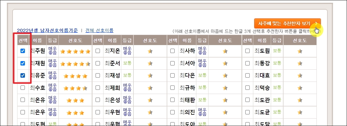 ▼[2022년생 남자 선호 이름 기준] 버튼을 눌러보았습니다. 추가로 300개를 확인할 수 있는데요. 여기에서 3개를 선택한 후 [사주에 맞는 추천한자 보기] 버튼을 눌러봅니다.