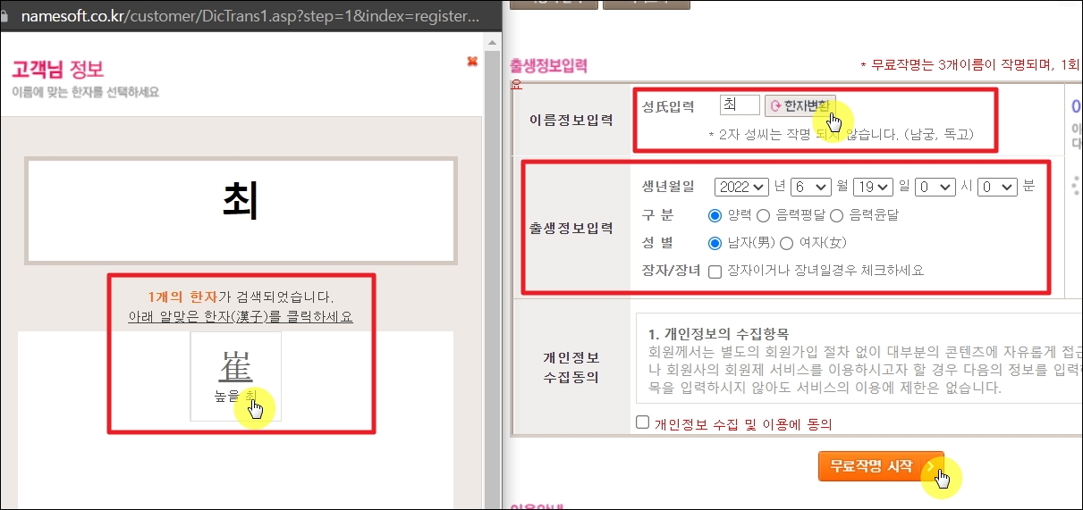 ▼남자 이름을 많이 보는 것이 중요한 것은 아닙니다. 이것을 사용할 사람에게 맞는 것을 찾아보는 것이 중요하죠. 성 씨와 생년월일, 성별, 장자 및 장녀 여부를 입력한 후 [무료작명 시작] 버튼을 눌러봅니다.