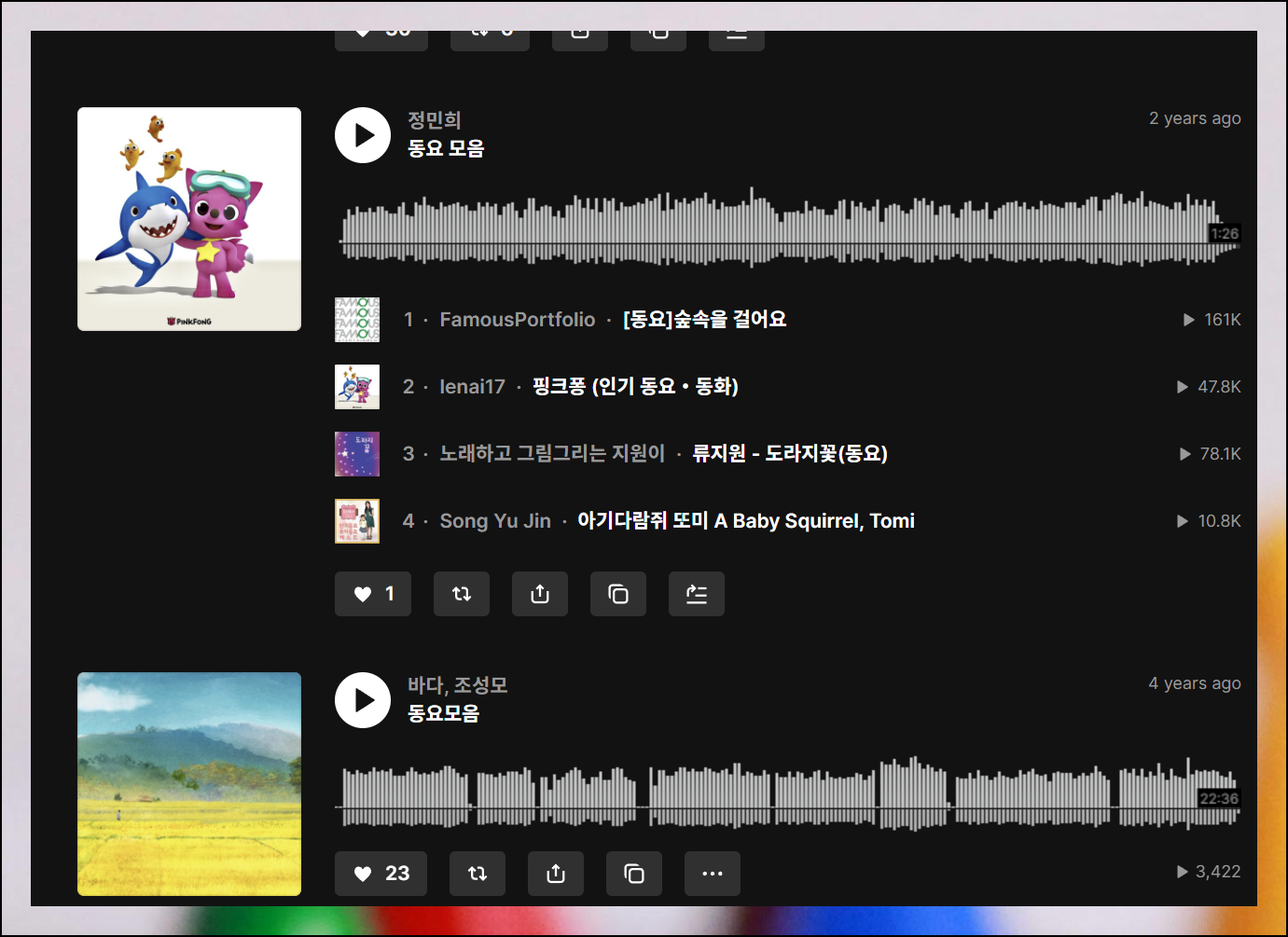 저는 평소 이용하는 특별한 음악 플랫폼을 소개해드리고 싶어요. 국내에서는 아직 많이 알려지지 않은 곳이지만, 어마어마한 양의 아기 동요를 연속으로 감상할 수 있는 사이트입니다. 여기서는 정말 다양한 길이의 트랙들을 만날 수 있는데, 짧게는 몇 분짜리 곡부터 길게는 몇 시간 동안 이어지는 긴 곡까지 선택할 수 있어요.