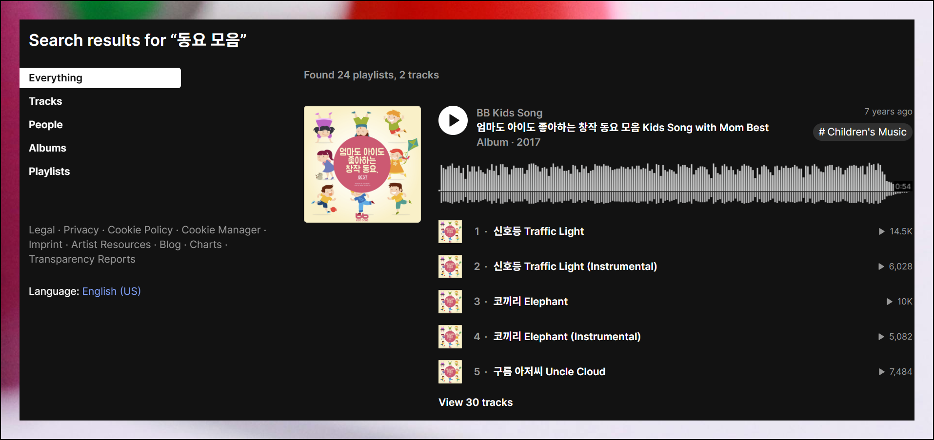 검색을 완료하면 무료로 연속듣기 가능한 콘텐츠가 꽤 많이 나타납니다. "엄마도 아기도 좋아하는 창작 동요 모음"이 눈에 띄네요. 한 번에 30곡을 연속듣기 가능한 모음집입니다. 여기서 재생 버튼을 누르면 바로 감상할 수 있어요.