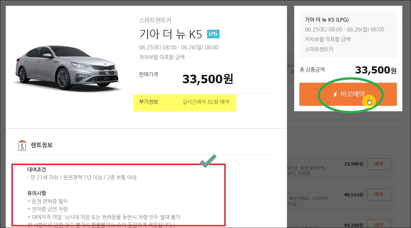 ▼예약을 진행하는 방법도 어렵지 않습니다. 새롭게 열린 페이지에서 제주도 렌트카 이용에 관련된 내용을 꼼꼼히 읽은 후에 [바로 예약] 버튼을 누르면 됩니다. 이후부터는 안내에 따라 결제까지 진행하면 됩니다. 렌트카 상품을 이용할 떄에는 사이트에 명시된 대여조건이나 유의사항을 꼼꼼히 읽어보시길 바랍니다. 일부 차량에 대해서는 조건이 까다로울 수 있기 때문입니다.