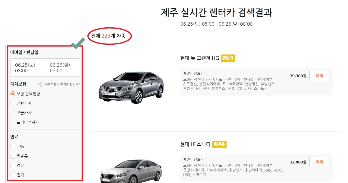 ▼제주도 실시간 렌터카 비교사이트가 열렸습니다. 제가 선택한 조건을 충족하는 상품이 223개나 나왔습니다. 꽤 많은 차종을 선택할 수 있게 되어 있는데요. 좌측에 보면 추가적으로 렌트카 상품에 대한 조건을 지정할 수 있습니다. 연료의 경우에는 LPG, 휘발유, 경유, 전기 중에서 이용하고 싶은 것을 선택해 보세요.