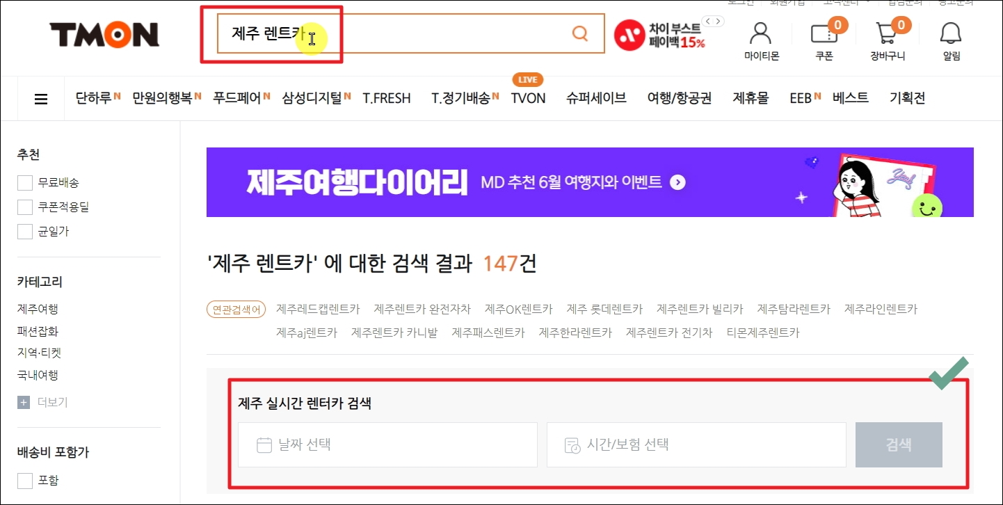 ▼방금 보여드린 제주도 렌트카 비교사이트는 티몬을 통해 접속이 가능합니다. 티몬에서는 다양한 상품과 서비스를 판매하고 있는데, 여기에는 제주도 렌트카 상품도 포함이 되어 있습니다.