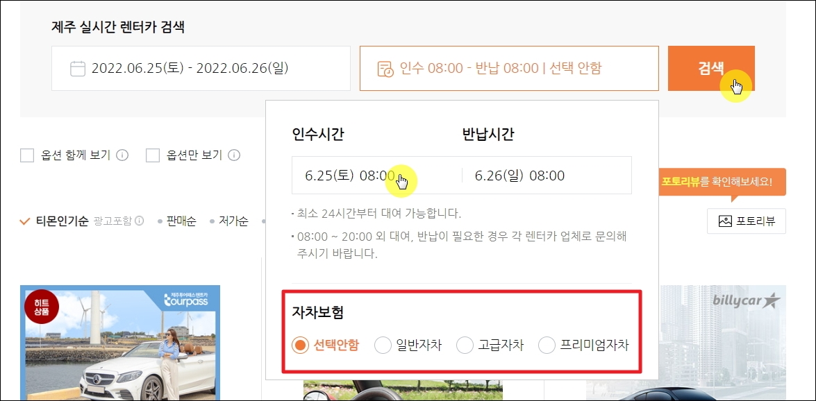 ▼날짜 입력 후에는 인수시간과 반납시간 그리고 자차 관련 사항을 지정합니다. 모두 입력했으면 [검색] 버튼을 누릅니다.