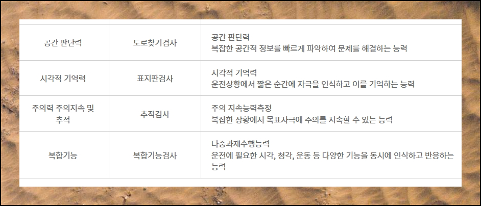 총 7개의 운전자 능력 평가 항목이 마련되어 있습니다. 앞의 3가지는 기초 실력을 점검하는 단계예요. 눈으로 볼 수 있는 범위가 얼마나 되는지 시야각을 재고요. 신호가 바뀔 때 얼마나 빠르게 반응하는지도 측정해요. 좌측과 우측을 제대로 구별하는지도 확인합니다. 뒤의 4가지는 실제 도로에서 필요한 기량을 평가해요. 목적지를 찾아가는 실력과 도로 표지 내용 기억하기, 차 안에 탑승자가 있는지 판별하기, 여러 업무를 동시에 수행하는 복합 기능까지 살펴봅니다. 평상시 운전하던 방식 그대로 편안하게 임하시면 됩니다.
