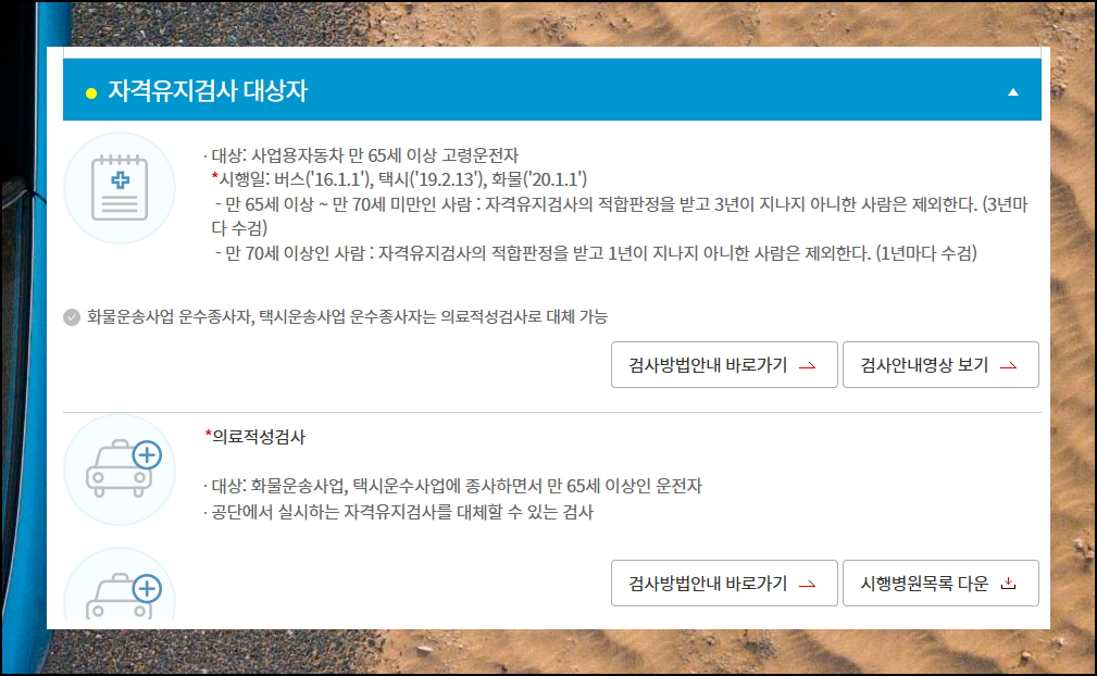 사업용 자동차를 운전하는 만 65세 이상의 고정운전자가 그 대상이 됩니다. 연령대별로 자격유지검사 받아야 하는 시기가 다르게 설정되어 있어요. 65세 이상 70세 미만의 운전자는 3년에 1회 받으면 충분하고요. 70세를 넘으신 분들은 1년에 한 번씩 정기 심사를 받아야 합니다.