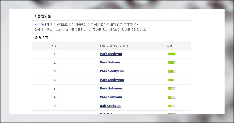 "더보기" 버튼을 클릭하면 빈도별 정렬 페이지로 이동해요. 방금 입력한 명칭이 현실에서 어떤 로마자표기로 가장 많이 쓰이는지 통계를 보여줍니다. 빈도 데이터를 살펴보니 PARK SOOHYUN 표기의 사용률이 높네요. 개인적으로도 PARK SOOHYUN이나 PARK SOOHYEON 같은 표기를 많이 봤던 것 같아요. 이런 통계 정보를 참고해서 선택하면 훨씬 안전한 결과를 얻을 수 있어요.