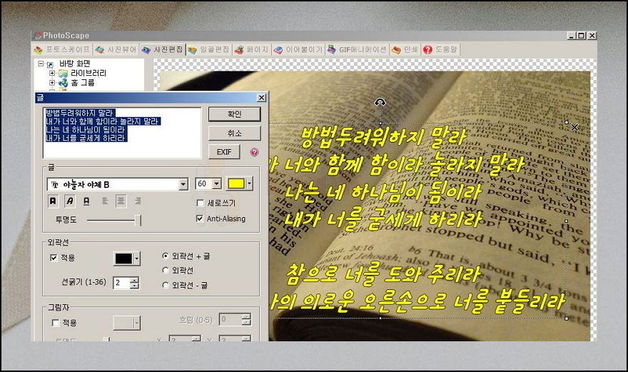 아름다운 배경 사진을 포토스케이프로 불러와 주세요. 그다음 사진 편집 탭을 클릭한 후 글 추가 기능을 선택하시면 됩니다. 홀리 바이블 사이트에서 구한 예쁜 구절이나 성경말씀을 실제로 적용해보세요.