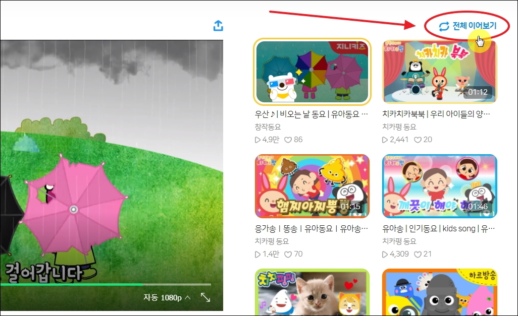 ▼여기 있는 컨텐츠를 가지고 무료연속듣기 진행을 해보겠습니다. 사이트에서 우측 상단에 있는 [전체 이어보기] 버튼을 클릭하면 됩니다. 그럼 하나의 유아동요 컨텐츠가 끝나면 바로 다음 컨텐츠가 재생이 됩니다. 이런 식으로 연속듣기를 할 수 있어요.
