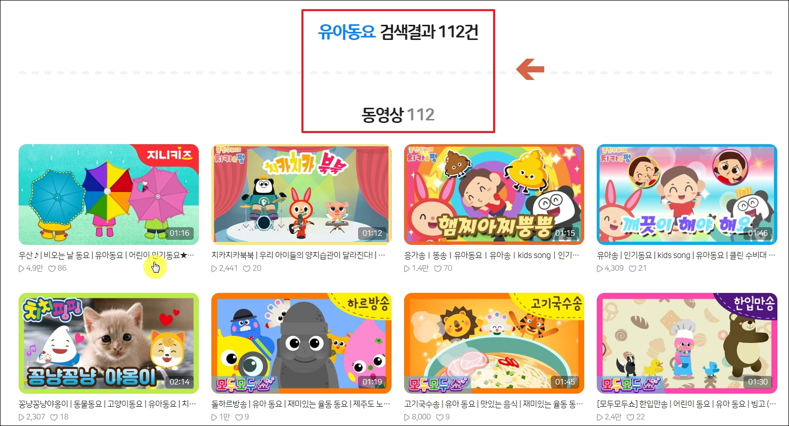 ▼유아를 위한 동요 컨텐츠가 112건이나 나왔습니다. 옛부터 전해 내려온 전통동요는 물론이고, 생활이나 교육에 맞춘 동요 컨텐츠도 있습니다. 여기 있는 영상은 모두 무료로 이용이 가능하고, 연속듣기 재생도 할 수 있습니다.