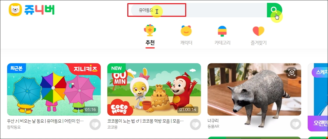 ▼사이트에 접속하면 여러가지 추천 영상이 나타납니다. 상당 부분 유아보다는 어린이 전용 컨텐츠가 많이 있는데요. 여기서 유아 전용 컨텐츠를 골라 보고 싶다면 검색창에 "유아동요" 입력 후 검색 버튼을 클릭하면 됩니다.