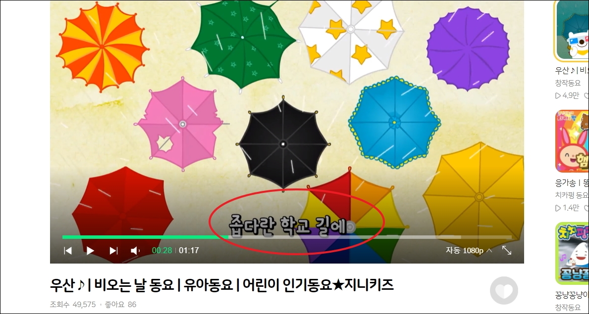 ▼나타난 동요 중 하나를 선택해 보았습니다. 바로 동영상 플레이어를 통해 재생이 가능한데요. 다음과 같이 노래가 나오면서 화면에는 재미있는 영상과 가사가 나타납니다. 한글을 익힌 후에는 가사를 보고 따라 부르면 좋겠네요.