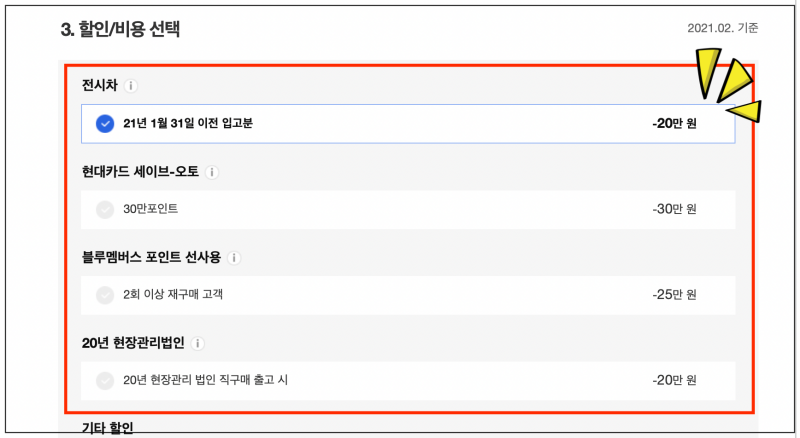 이번에는 현대자동차에서 최근에 제공하고 있는 할인 조건을 선택하는 일이에요. 전시차를 구입하는 경우에 일반적인 가격보다 저렴하게 신차 구입이 가능해요. 현대카드나 블루멤버스 관련 이벤트를 이용해도 되고요.
