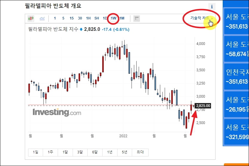 ▼위와 같은 기술 차트와 함께 미국 필라델피아 반도체 지수에 대한 다방면의 정보를 얻는 방법을 알려드리겠습니다. 인베스팅 사이트를 이용해볼 건데요. 무료로 이용할 수 있고, 많은 정보를 신속하게 얻을 수 있다는 장점이 있습니다.