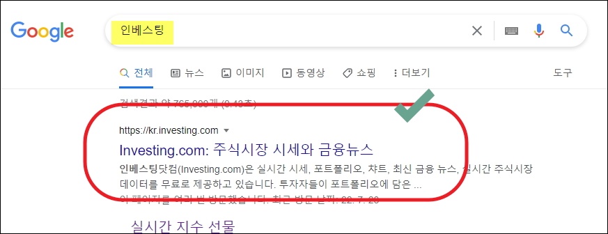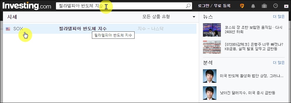 ▼인베스팅 사이트에 접속하여 화면 중앙에 있는 검색창을 이용해 보겠습니다. 해당 부분을 클릭한 후 "필라델피아 반도체 지수"를 입력해 보세요. 그럼 해당 지수에 대한 코드인 SOX가 나타납니다. SOX를 클릭해 주세요.