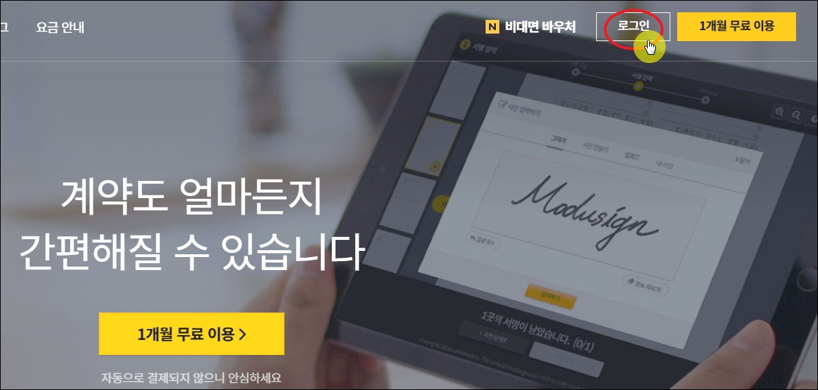 ▼모두싸인 홈페이지에 접속했습니다. 이곳은 전자계약 관련 서비스를 제공하는 곳인데요. 전자계약에 대한 것은 유료이지만, 인터넷 도장을 만드는 프로그램을 사용하는 것은 무료로 제공하고 있습니다. 해당 프로그램을 이용하기 위해 로그인은 필수인데요. 입력해야 할 내용이 적기 때문에 1분 만에 가입이 가능합니다.