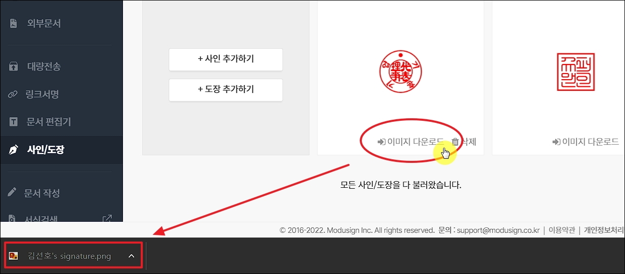 ▼로그인을 하면 다음과 같은 관리 페이지가 열립니다. 여기에서 좌측 하단에 있는 [사인/도장] 메뉴를 클릭해 주세요. 그럼 우측에 사인과 도장을 추가할 수 있는 버튼이 나타납니다. 기존에 만든 인터넷 도장 이미지도 보이네요.