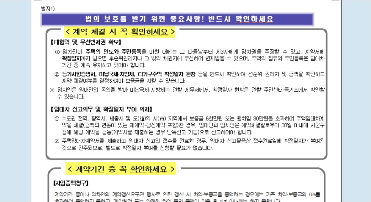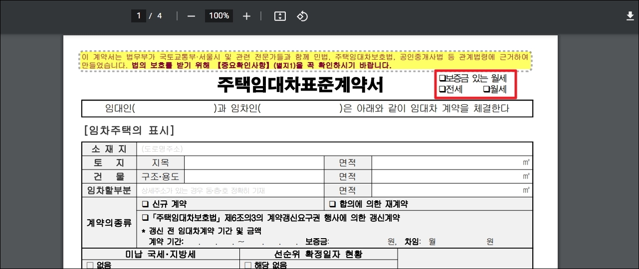 ▼다음과 같이 우리가 다운 받아 사용할 계약서 양식은 공공기관에서 여러 전문가들과 함께 만들었습니다. 법의 보호를 받기 위해 꼭 확인해야 하는 부분도 첨부가 되어 있죠. 보증금 있는 월세, 전세, 월세 이렇게 임대차 계약서를 작성해야 하는 모든 상황에서 사용이 가능합니다.