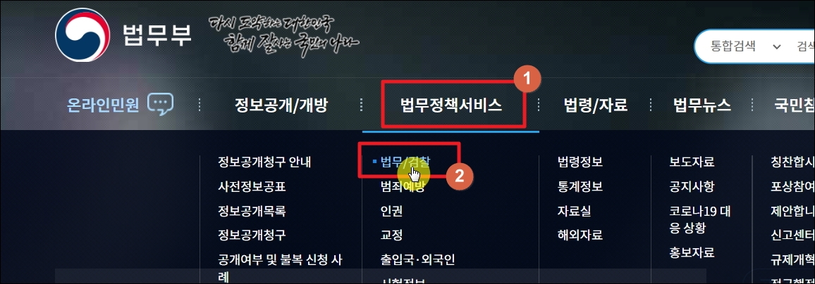 ▼법무부 공식 홈페이지에 접속했습니다. 메뉴를 보면 여러 가지 법무 관련 서비스와 정보가 나타나는데요. 여기에서 [법무정책 서비스]와 [법무/감찰] 메뉴를 차례대로 클릭해 주세요.