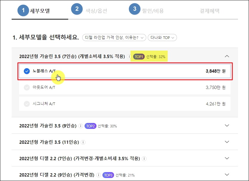 ▼이제부터 3가지 과정을 거치면 카니발 7인승에 대한 최종 가격표를 만나볼 수 있습니다. 가장 먼저 세부모델 입니다. 선택률을 보면 7인승과 9인승의 인기가 높네요. 노블레스, 아웃도어, 시그니처는 앞서 살펴본 사양과 옆에 나온 가격표를 감안하여 본인 취향에 맞게 고르면 됩니다.