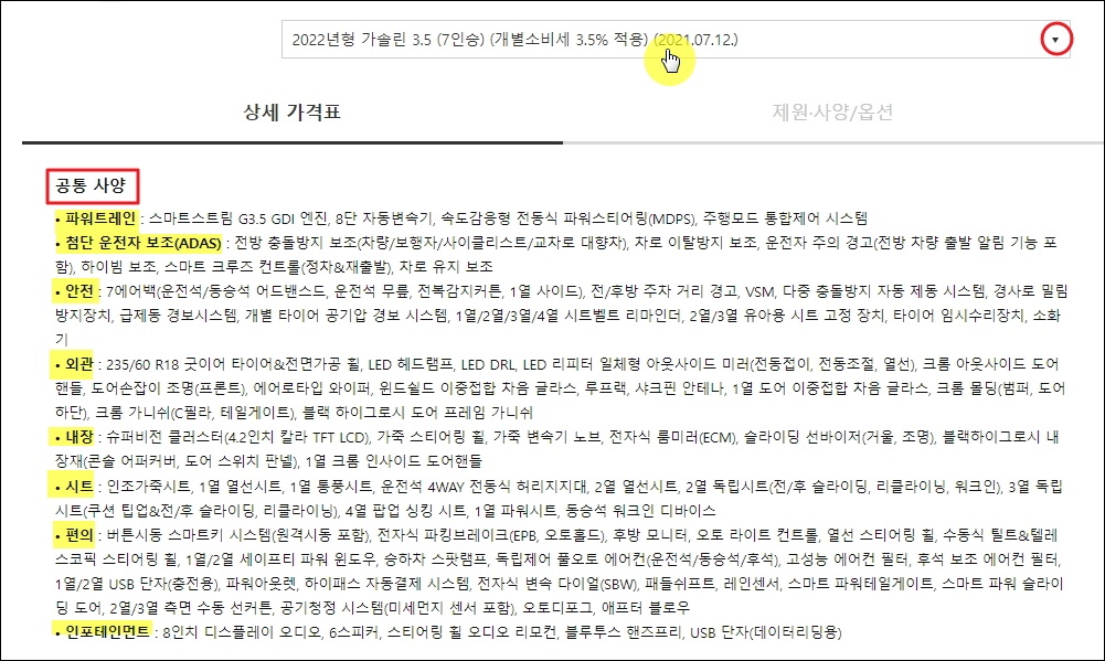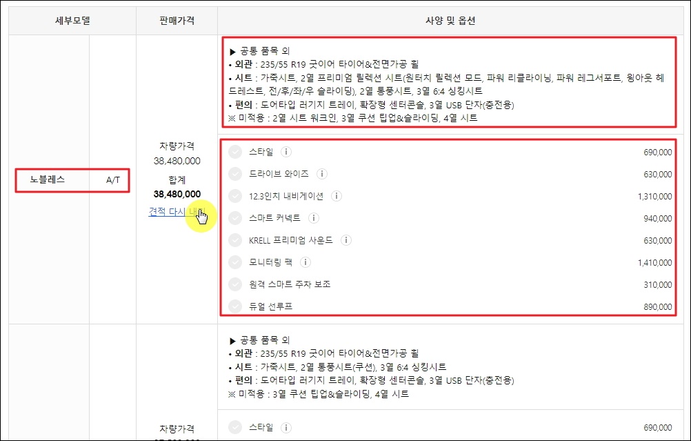 ▼공통 사양 다음으로는 개별 세부모델에 대한 사양 및 옵셥 정보가 나타납니다. 꼼꼼히 살펴보고 본인이 선택할 세부모델을 결정합니다. 그 다음 표에서 [견적 다시 내기] 버튼을 눌러주세요.
