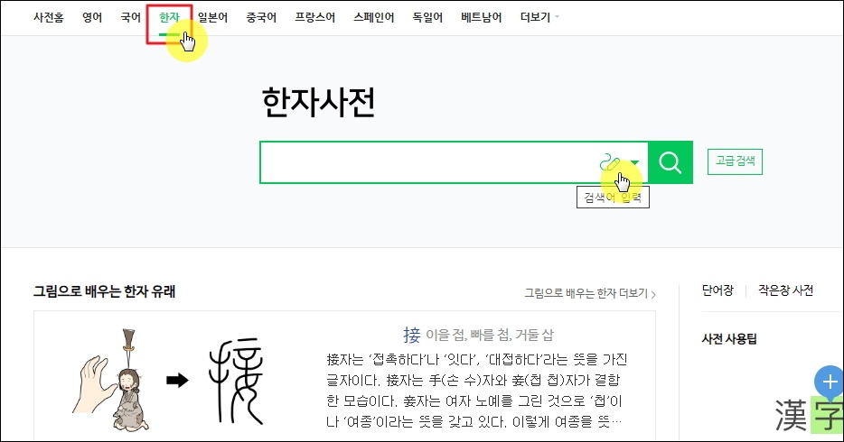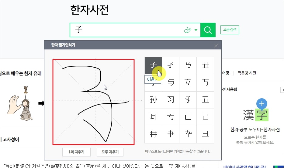 ▼일반적으로 모르는 한자를 입력하거나 이에 대해 알아보려고 할 때에는 해당 한자에 대한 한글 음을 알고 있어야 합니다. 요즘에는 아무것도 몰라도 다음과 같이 한자 입력을 할 수 있습니다. 마우스로 모양을 그리기만 하는데요. 간단하게 그려서 입력한 내용을 바탕으로 해당하는 단어나 성어가 가진 모든 뜻과 함께 각 한자에 대한 뜻과 음을 바로 확인할 수 있습니다.