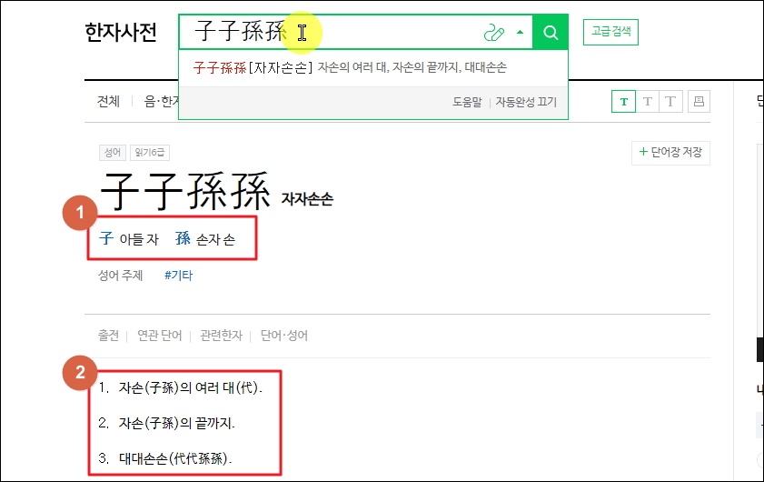 "아들 자"에 관련 있는 단어와 성어의 수가 4,159개나 되네요. 이 중에서 하나를 선택하면 앞서 본 바와 같이 단어 및 성어의 뜻과 이를 구성하는 개별 한자에 대한 음과 뜻을 찾아볼 수 있습니다.