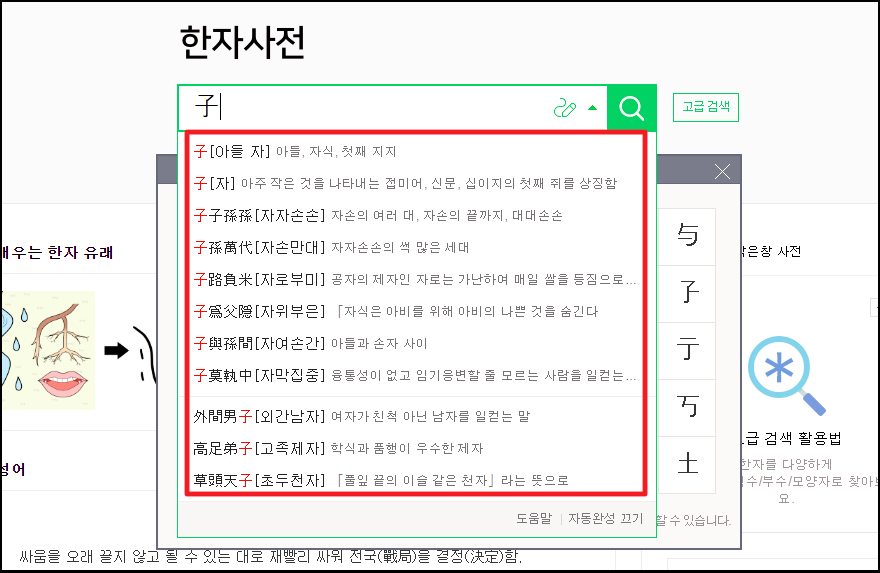 ▲ "아들 자"라는 문자를 검색한 결과입니다. 관련된 단어, 성어, 뜻 풀이, 부수, 모양자, 학습 정보가 나타납니다.