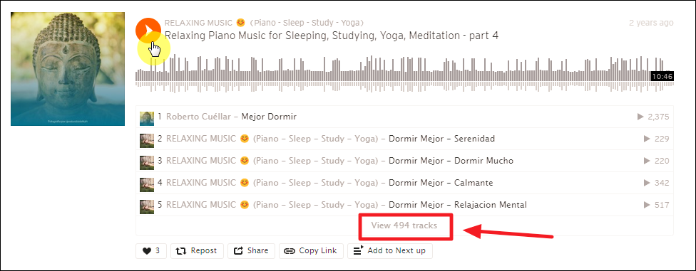 ▲ 제가 찾아본 명상음악 리스트 중에 하나 입니다. 한 번에 494개의 트랙을 연속듣기 가능한데요.