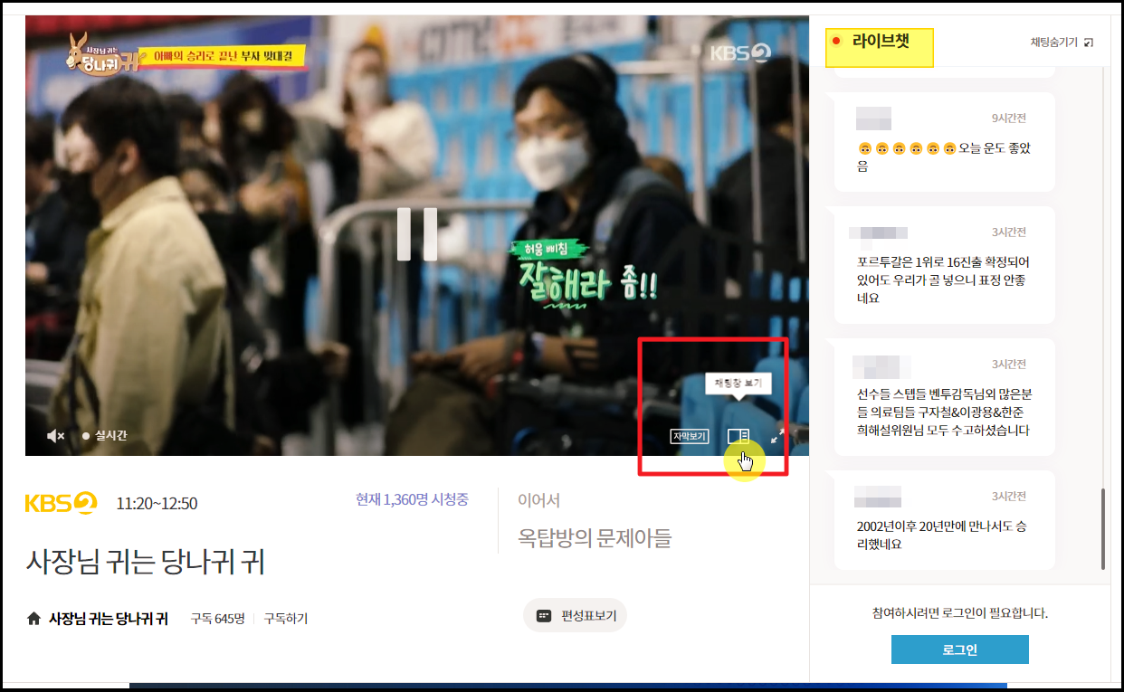 자막 보기도 가능하오니 조용한 공간에서 시청하는 분이라면 이용해 보세요. 그리고 채팅창도 열 수 있는데요. 이 채팅창을 통해 같은 kbs2 프로그램을 시청하는 사람들과 실시간으로 대화를 할 수 있습니다.