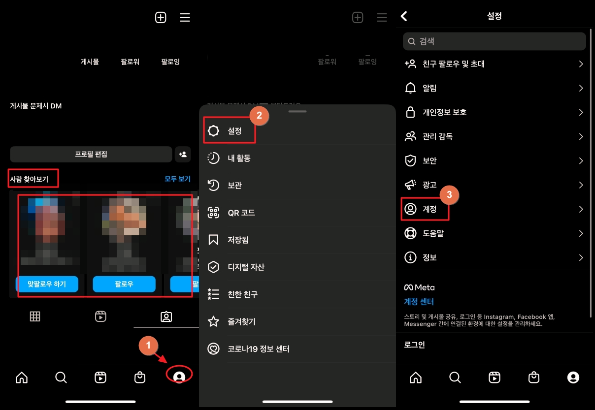 여기서 찾고자 하는 사람을 찾을 수 있겠지만, 그렇지 못하다면 화면에서 우측 하단에 있는 사람 모양의 아이콘을 클릭합니다. 그 다음 [설정], [계정]을 차례대로 터치해서 들어가주세요.