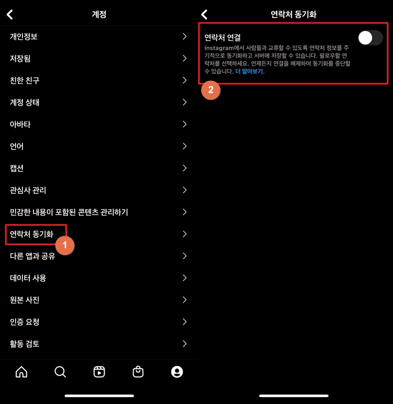 ▲ 계정 페이지가 열리면 여러 가지 계정 관련 메뉴가 나타나는데요. 여기에서 [연락처 동기화] 메뉴를 선택합니다. 그렇게 해서 이동한 화면에서 [연락처 연결]을 켜주세요. 이 때 찾고자 하는 전화번호를 본인의 스마트폰 연락처에 저장해 두어야 합니다. 그 다음 연결을 해야지 사람찾기 진행을 할 수 있어요.