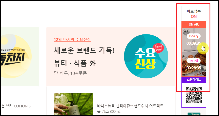 이 방법 또한 매우 간단한데요. 사이트에서 오른편에 보면 ON AIR 버튼이 있습니다. TV쇼핑과 TV+샵 이렇게 2가지가 있는데요. 보고 싶은 컨텐츠를 클릭해 보세요.