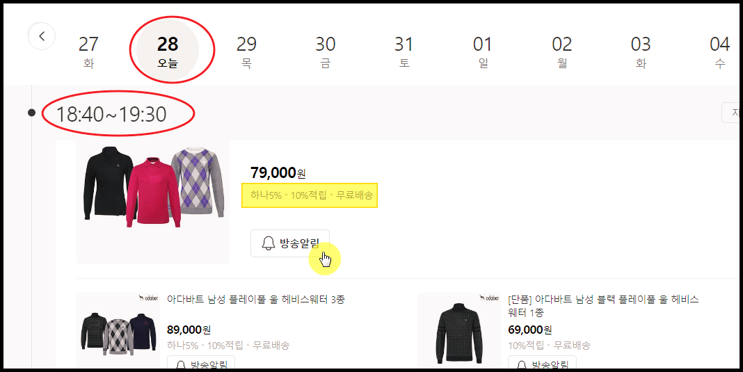 여기를 보면 날짜 및 시간별로 어떤 상품에 대한 방송이 나오는지 알 수 있는데요. 방송편성표 페이지를 자세히 보면 아시겠지만, 추가 할인 및 추가 적립을 얼마나 받을 수 있는지 편성표 내용에 표시가 되어 있습니다.