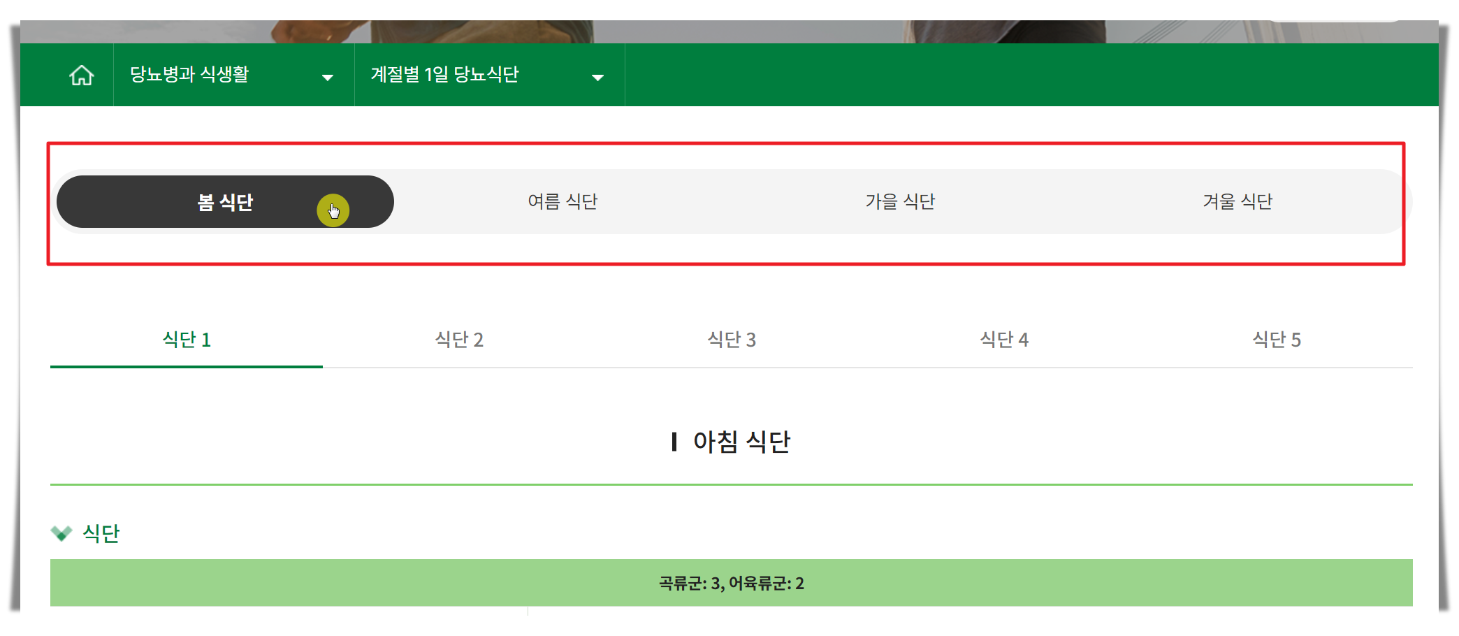 계절별 1일 당뇨식단 페이지를 보면 각 계절에 구하기 쉽거나 영양가 있는 재료를 가지고 만들 수 있는 식단을 알려줍니다.