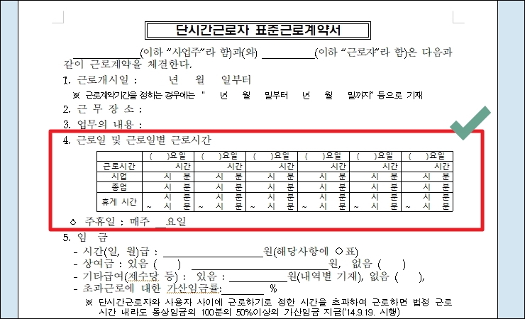 다음과 같이 단시간근로자 전용 표준 근로계약서 양식도 포함이 되어 있는데요. 해당 양식의 4번 항목인 "근로일 및 시간 정보"를 꼭 기재해야 합니다. 표에 있는 근로시간, 시업, 종업, 휴게 시간, 요일을 정확하게 입력해 주세요. 제가 첨부한 파일에 작성 예시가 포함되어 있으니 헷갈리는 분들은 예시를 참고하시길 바랍니다.