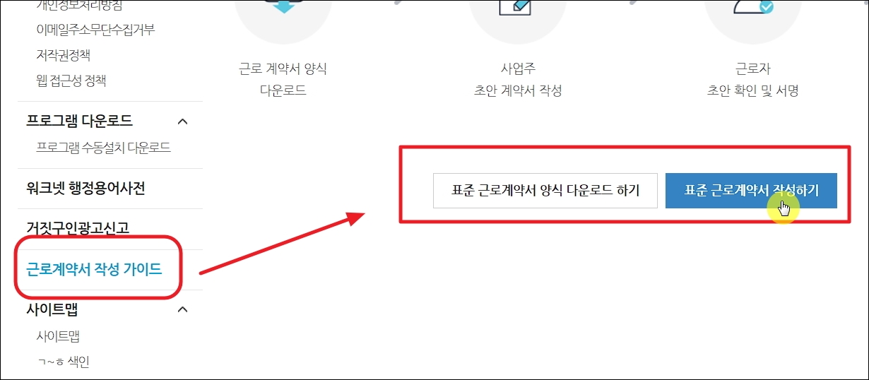 이용 안내 페이지가 열리면 좌측에 있는 여러 가지 메뉴 중에서 [근로계약서 작성 가이드]를 선택합니다. 그럼 "표준 근로계약서 양식 다운로드 하기"와 "표준 근로계약서 작성하기" 버튼이 나타나는데요. 여기서 오른쪽 버튼을 클릭한 후, 안내에 따라 온라인으로 계약서를 작성하면 됩니다.