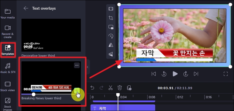 청중의 관심을 이끌어내고, 이해를 돕는 자막 넣기를 해볼게요. 프로그램에서 좌측 부분을 위치한 "Templates" 메뉴를 선택해 주세요. 그럼 여러 가지 스타일 요소를 클릭 한 번으로 추가할 수 있습니다. Text overlays 카테고리를 살펴보면 멋진 디자인의 자막을 구현할 수 있는 템플릿이 많습니다.