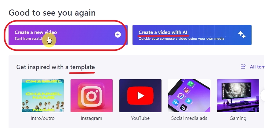 프로그램 설치가 완료되면 바로 실행해 주세요. 그럼 다음과 같은 화면으로 시작이 되는데요. 여기에서 [Create a new video] 버튼을 선택하면 됩니다. 요즘에 유행하는 AI 기술을 사용하고 싶다면 [Create a video with AI]를 선택하면 되는데요. 동영상 제작에 들일 시간이 부족할 때 사용하면 좋습니다. 화면 하단에 있는 템플릿은 인스타그램, 유튜브, 게임 등에 관련하여 해당 목적에 맞게 쉽게 동영상을 제작할 수 있도록 도와줍니다.