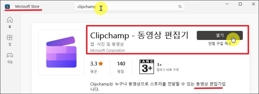 제가 만든 작품을 만들기 위해 사용한 동영상 제작 프로그램은 "Clipchamp" 인데요. 무료로 사용할 수 있습니다. 일부 유료 서비스가 있긴 하지만, 동영상 제작에 필수적으로 사용되는 기능은 무료에요. 그럼 윈도우에서 Microsoft Store 앱을 실행한 후 "clipchamp" 검색해 보세요. 그럼 바로 해당 프로그램을 설치할 수 있어요.