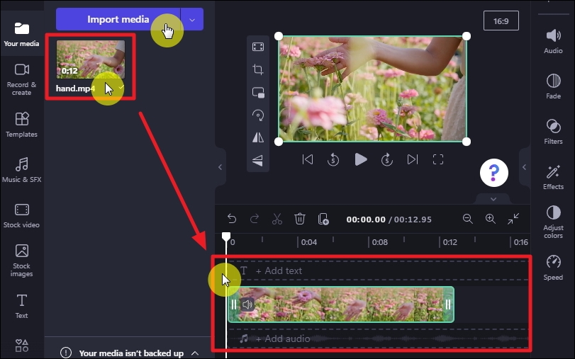 프로그램에서 [Create a new video] 버튼을 누르면 다음과 같은 화면이 나타나는데요. 동영상 제작에 사용할 미디어(사진이나 동영상, 음악) 파일을 추가해야 합니다. [Import media] 버튼을 클릭한 후 추가할 파일을 선택하면 되는데요. 그 다음 동영상에 나타날 순서에 맞게 우측 하단에 있는 타임라인에 추가해 주세요. 좌측 영역에 등록된 미디어 소스를 클릭한 상태에서 타임라인 영역으로 드래그를 하면 됩니다.