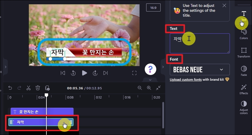 추가한 자막에 대하여 내용, 글자의 색과 폰트 크기, 색 등을 내 마음대로 수정할 수 있는데요. 타임라인에 등록된 자막 소스를 마우스로 클릭해 보세요. 그 다음 프로그램 오른편에 있는 메뉴에서 [Text]를 선택하면 됩니다. 그럼 자작의 내용과 폰트를 변경할 수 있어요. Text 메뉴 아래에 있는 Colors, Transform, Fade, Effects를 선택하면 자막에 관련된 다양한 수정이 가능합니다.