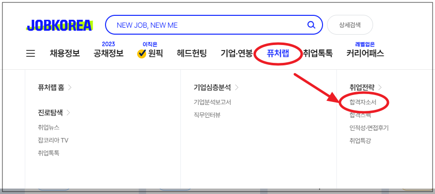 3. 사이트에 접속하면 메뉴에서 퓨처랩을 선택해 보세요. 퓨처랩의 하위메뉴는 여러 가지 카테고리로 구분이 되어 있는데요. 취업전략 카테고리에서 합격자소서 메뉴를 선택해 보세요.